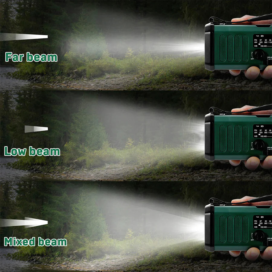 Med en kraftig 10.000 mAh powerbank, indbygget solpanel, håndsving-generator og AM/FM-radio, har du et pålideligt redskab, der sikrer strøm, lys og nyhedsopdateringer – selv i langvarige nødsituationer.